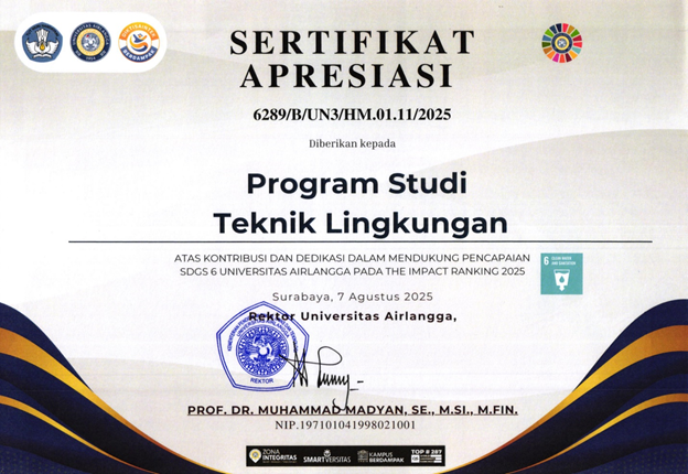 Surabaya, 17 Agustus 2025 – Program Studi Teknik Lingkungan Fakultas Sains dan Teknologi (FST) Universitas Airlangga (UNAIR) memperoleh apresiasi atas kontribusinya dalam mendukung capaian Sustainable Development Goals (SDGs) 6: Clean Water and Sanitation UNAIR, yang meraih peringkat 1 dunia versi THE Impact Rangkings 2025. Penghargaan tersebut diberikan oleh Bapak Rektor, Prof. Dr. Muhammad Madyan, SE., M.Si., M.Fin., dalam acara penyerahan sertifikat apresiasi yang merupakan salah satu dari serangkaian acara perayaan hari kemerdekaan Indonesia yang ke-80, yang diselenggarakan pada Minggu (17/8/2025) di halaman Kantor Manajemen Kampus MERR-C.