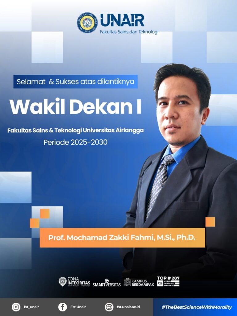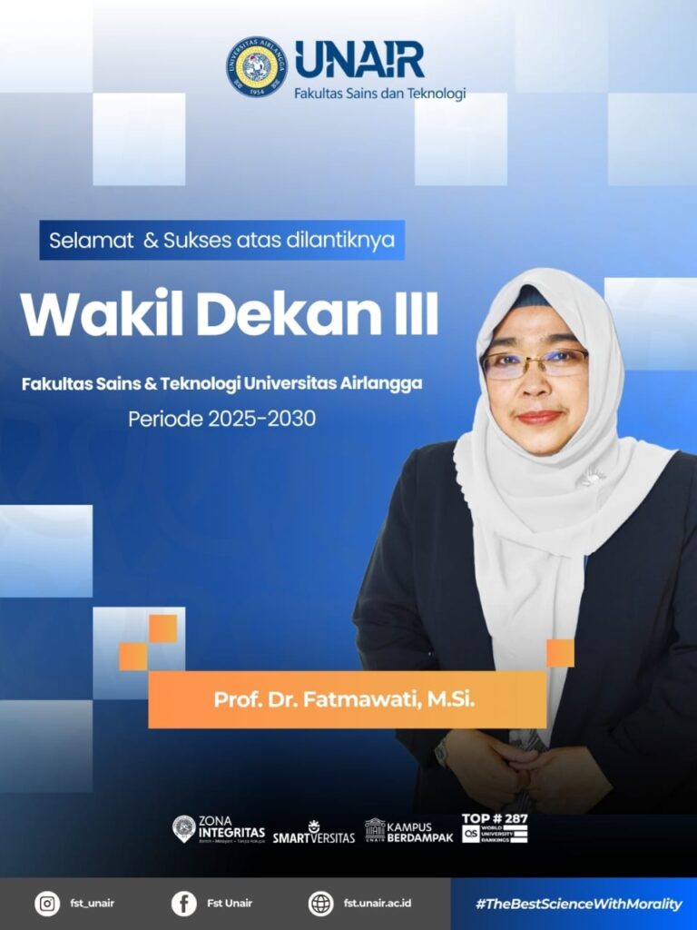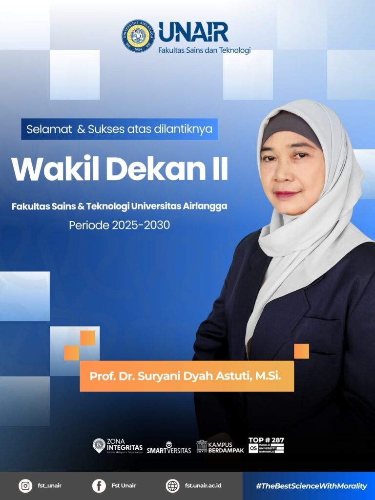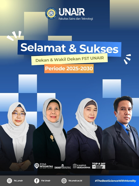Ucapan selamat ditujukan kepada Prof. Dr. Miratul Khasanah, M.Si. sebagai Dekan, Prof. Mochamad Zakki Fahmi, M.Si., Ph.D. sebagai Wakil Dekan I, Prof. Dr. Suryani Dyah Astuti, M.Si.sebagai Wakil Dekan II, dan Prof. Dr. Fatmawati, M.Si. sebagai Wakil Dekan III. Kepemimpinan baru ini diharapkan mampu memperkuat langkah FST UNAIR dalam pengembangan pendidikan, riset, pengabdian masyarakat, serta perluasan jejaring kolaborasi internasional. Dengan semangat kebersamaan, periode 2025–2030 diyakini akan menjadi era penuh inovasi, kolaborasi, dan prestasi bagi Fakultas Sains dan Tekno