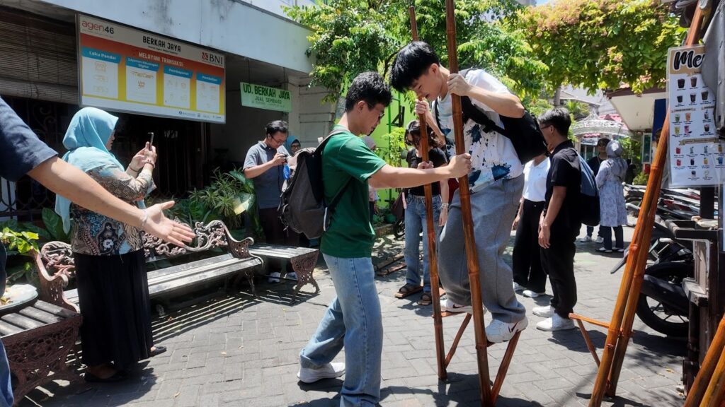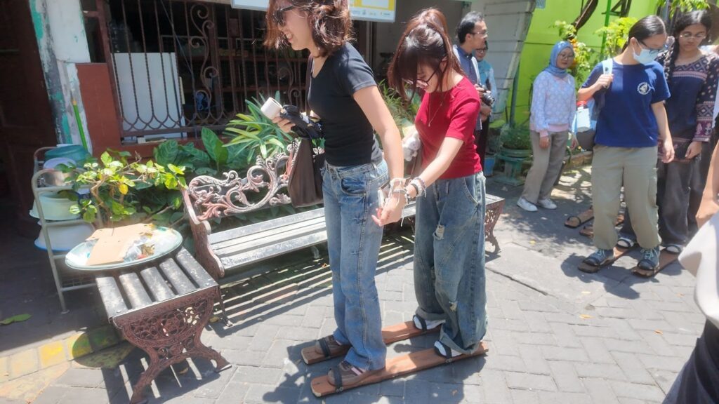 Selain kegiatan edukatif, para peserta juga diajak untuk merasakan keseruan permainan tradisional Indonesia seperti enggrang dan bakiak. Gelak tawa dan semangat kebersamaan terlihat jelas saat para mahasiswa internasional mencoba menjaga keseimbangan di atas enggrang dan beradu cepat menggunakan bakiak bersama teman satu tim. Momen ini menjadi pengalaman berharga yang mempererat interaksi lintas budaya dengan cara yang menyenangkan dan penuh makna.