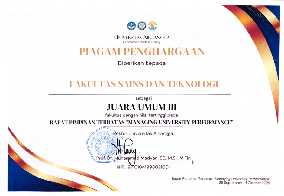 Surabaya, 18 November 2025 – Fakultas Sains dan Teknologi (FST) Universitas Airlangga (Unair) meraih penghargaan sebagai Juara Umum III Fakultas dengan Nilai Tertinggi pada acara Rapat Pimpinan Terbatas “Managing University Performance” yang diselenggarakan pada 29 September – 1 Oktober 2025. Penghargaan ini diberikan sebagai bentuk apresiasi atas praktik baik FST Unair dalam pengelolaan dan peningkatan kinerja akademik, riset, serta kolaborasi dengan berbagai pihak untuk mendukung kemajuan Universitas Airlangga.